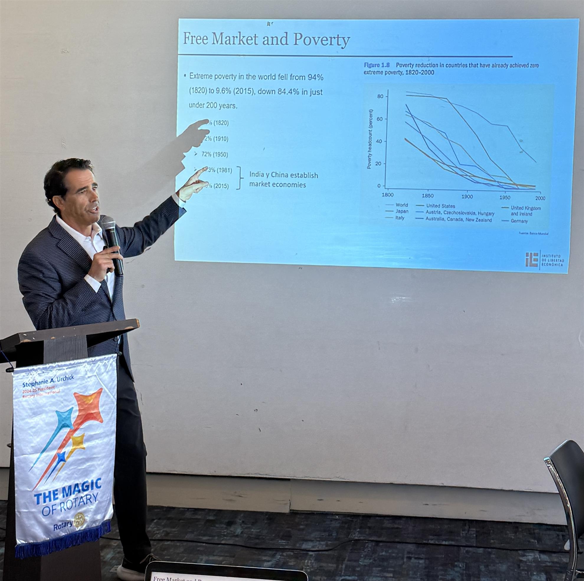 Our Tuesday speaker, Jorge Luis Rodriguez, founder and president of the think tank, Instituto de la Libre Economía, presented convincing data on how an overregulated market economy such as we experience in Puerto Rico does not permit its citizens to flourish and how Puerto Rico is last as compared to the other 50 states and fares very badly worldwide. ILE’s position is that we need to change our mindset with respect to the Government’s role that should focus on critical institutional areas such as education, health, and infrastructure. He covered the topic in the allotted time, but no one left after the formal closing of our meeting at 1:30 for the question-and-answer period that lasted almost a half hour.