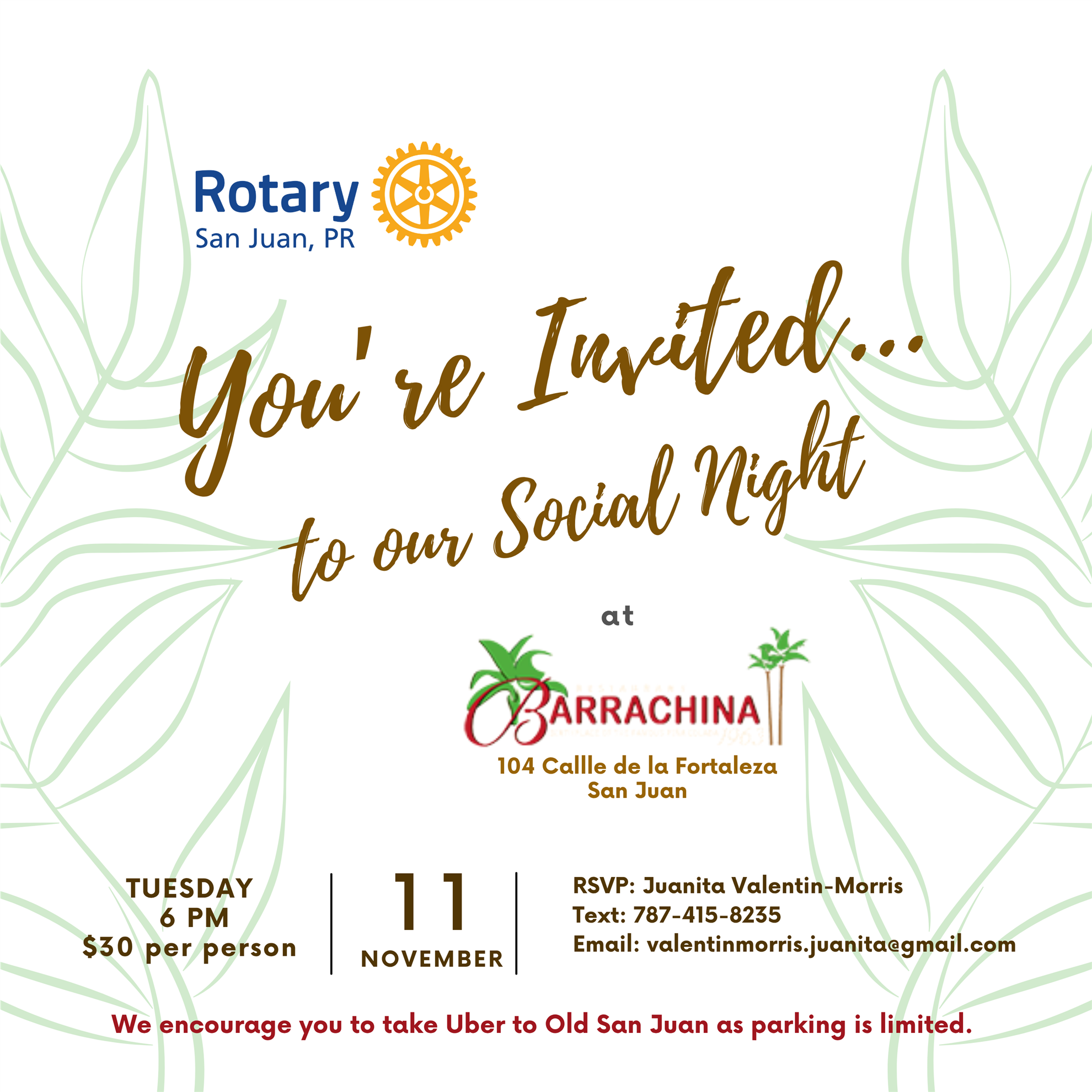 Join us for an evening of fellowship on Tuesday, November 11th, at 6:00 PM, at Barrachina Restaurant in Old San Juan—the birthplace of the piña colada and owned by longtime club member William Mev.